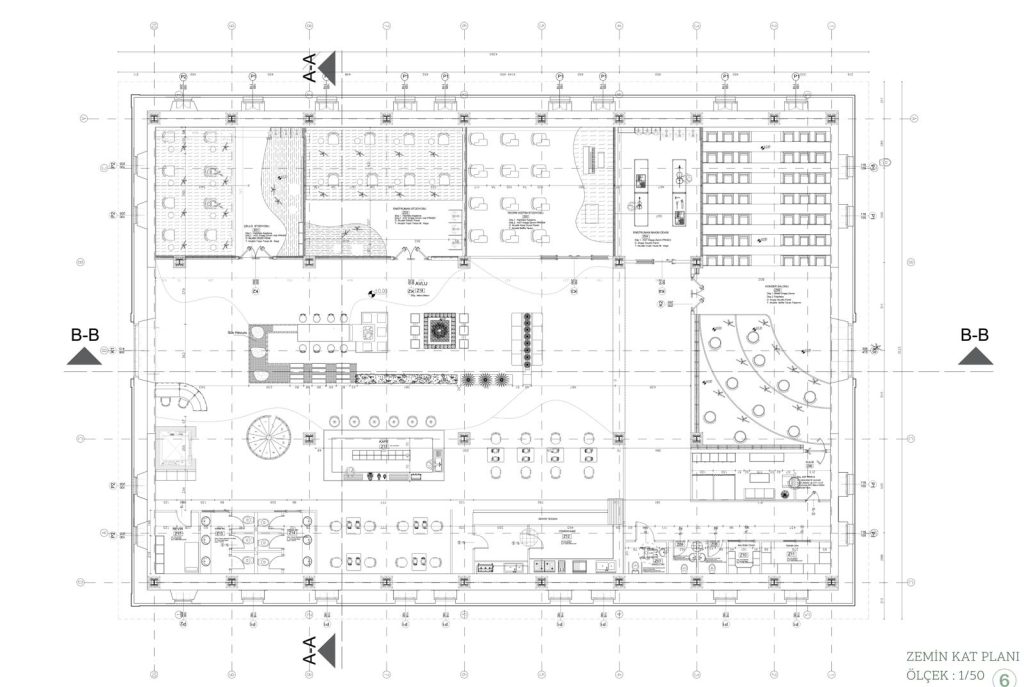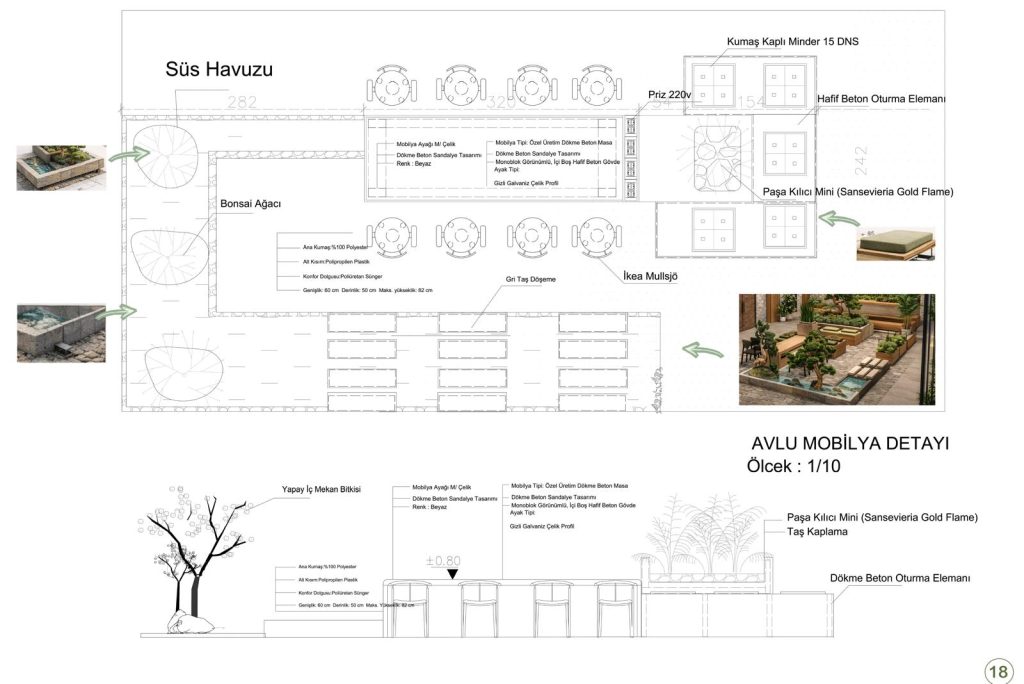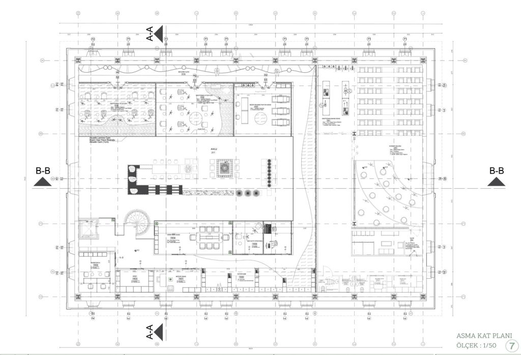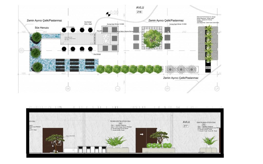 • Avlu mekanını özel tasarım oturma elemanları , çalışma alanı ve sosyalleşme alanları peyzaj ile güçlendirilmiştir