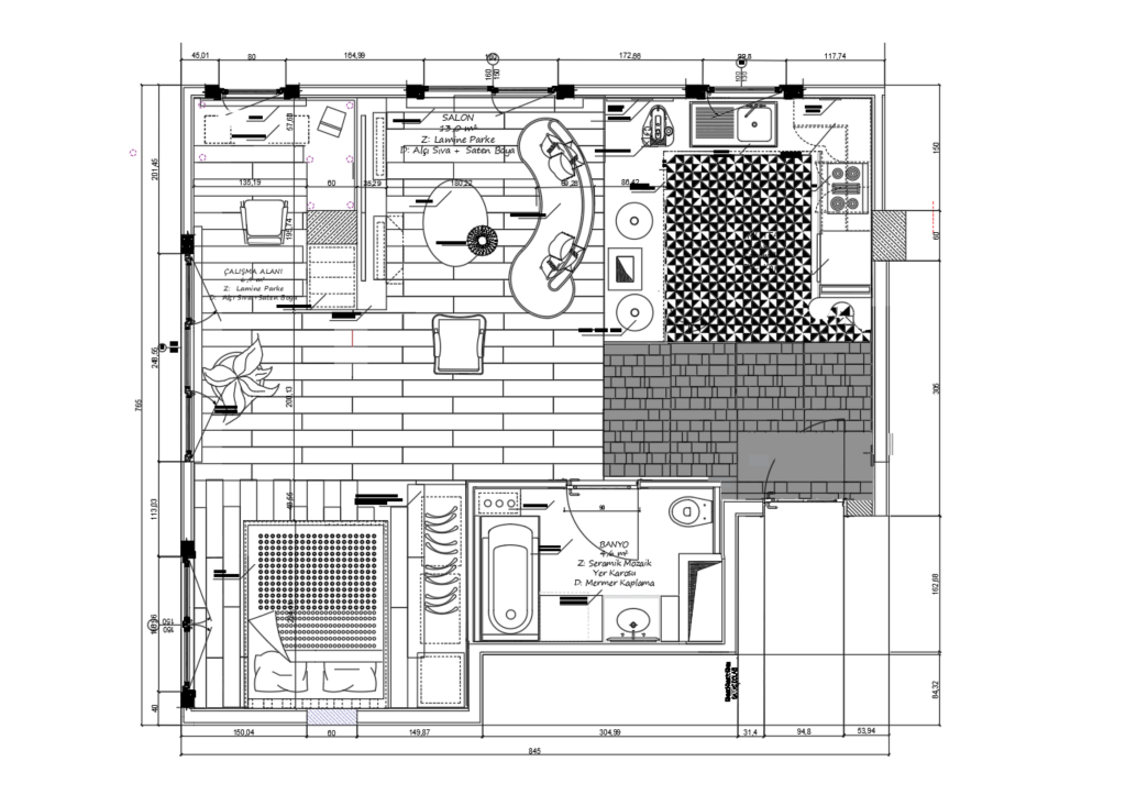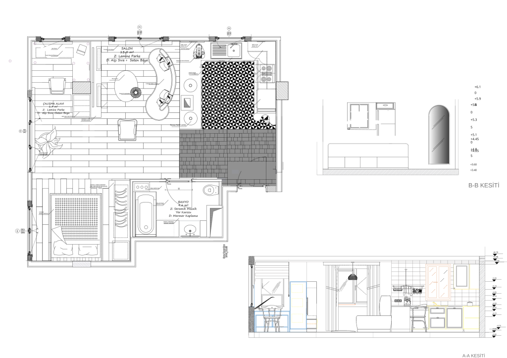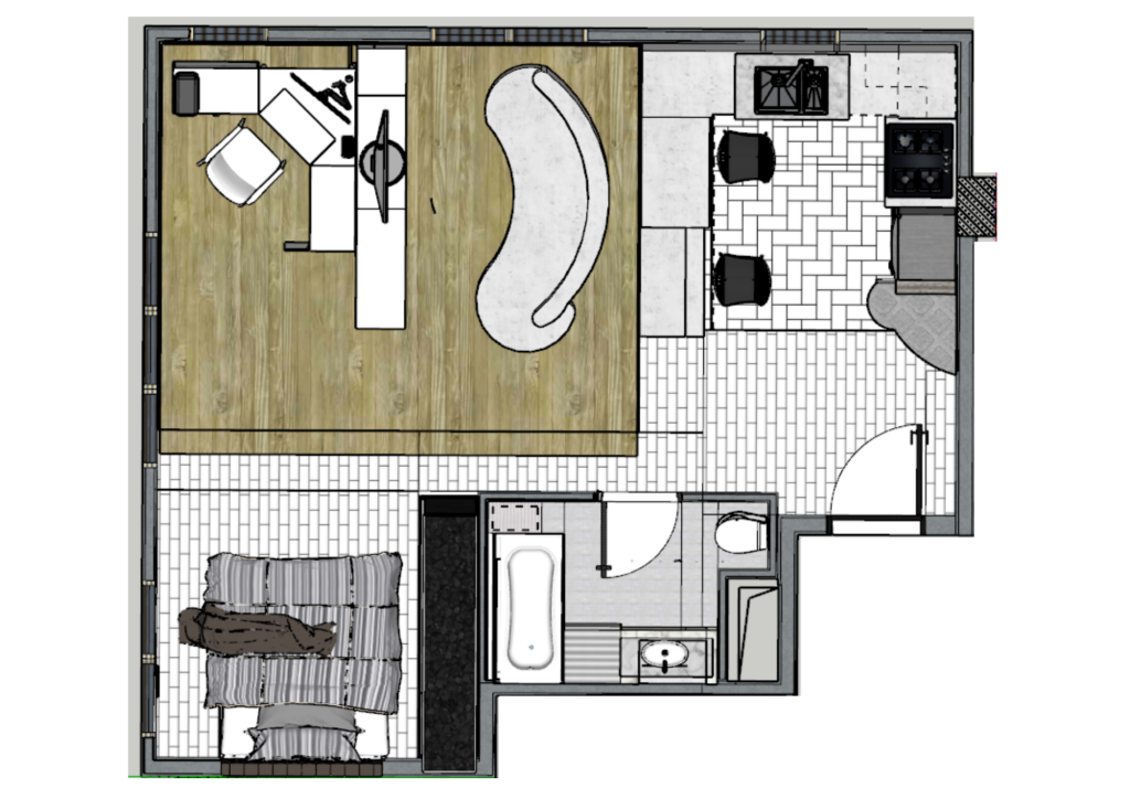 - Yaşam Alanı tasarımı bölücü bir duvar ile bölünerek Çalışma Alanı yaratıldı.